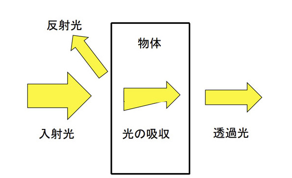 2.1 光の吸収と反射 物体に入射した光は図2-1に示すように、一部が表面で反射され、その残りの光が物体内部に入り込みます。物体内を通過する間にだんだんと吸収されて減衰し、残余の光が透過して出ていきます。光が持つエネルギーは反射では失われませんが、物体内で吸収されるとそのエネルギーが物体に与えられます。